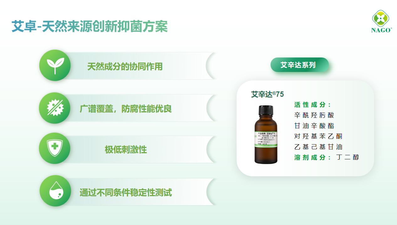 艾辛達(dá)®75——以天然抑菌成分辛酰羥肟酸為核心,復(fù)配甘油辛酸酯、對(duì)羥基苯乙酮及乙基己基甘油形成螯合-抗氧-抑菌三重屏障,天然成分占比75%超越歐盟ECOCERT天然認(rèn)證基線。適用于面膜、膏霜等多元體系,通過(guò)皮膚刺激性測(cè)試驗(yàn)證,實(shí)現(xiàn)安全與功效的精準(zhǔn)平衡。